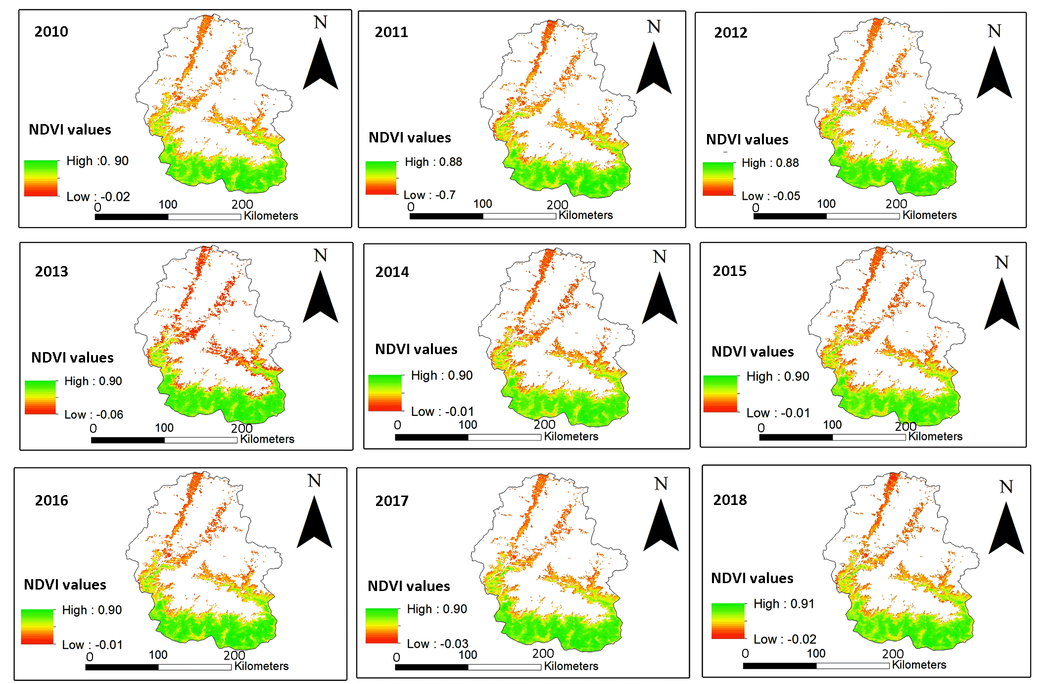 Time series annual NDVI datasets were processed with the help of ArcGIS 10.5 and finally those data were analyzed for the distribution, calculation of changes and mapped accordingly (Figure 2).