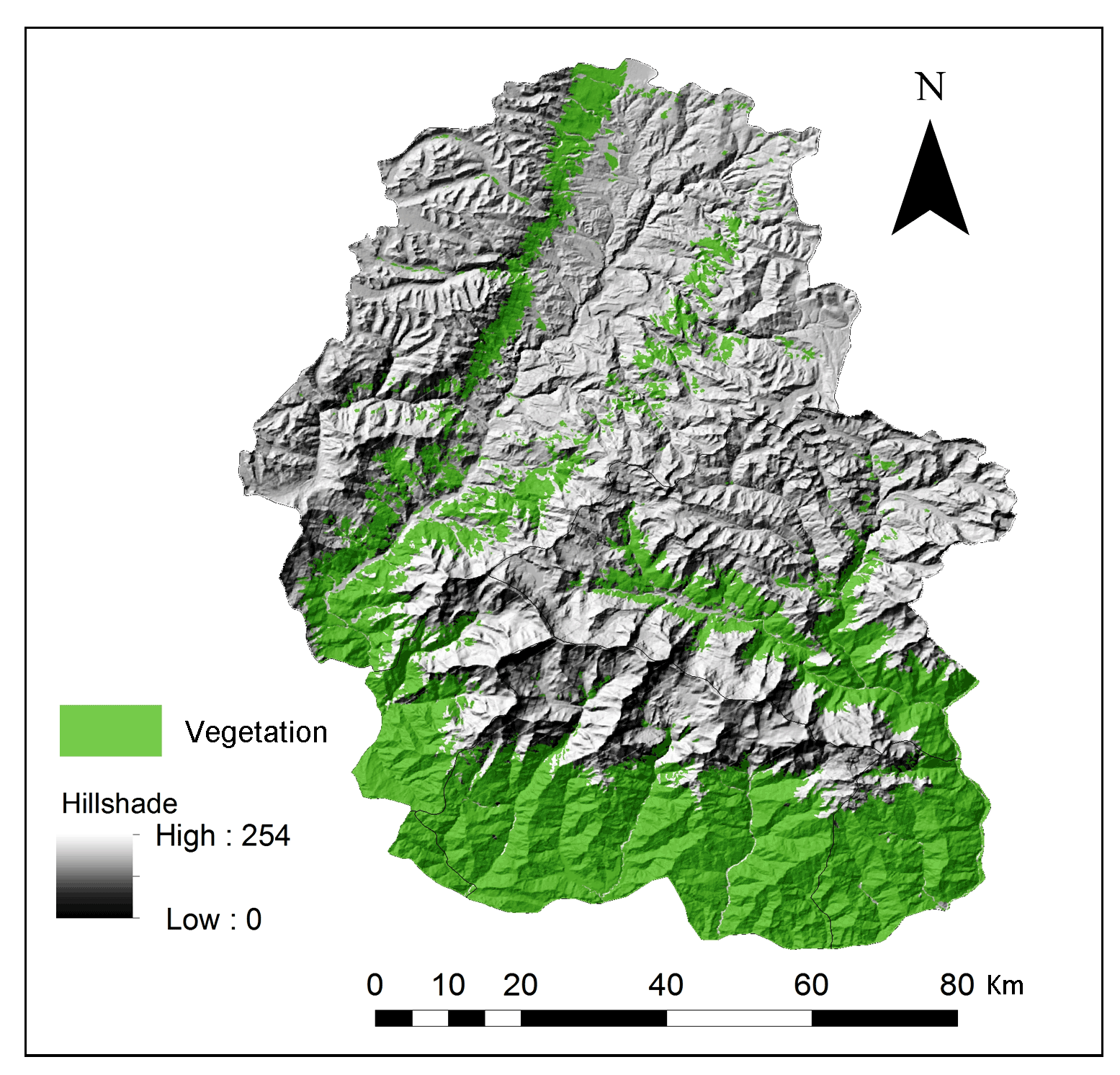 LULC datasets have an overall accuracy of the classification 85.13% with producer’s and user’s accuracies at 81% and 82%, respectively. Kappa statistics value was 0.82. These datasets were categorized into major LULC classes such as agricultural land, snow cover, water body, bare land, forest cover, and grassland.