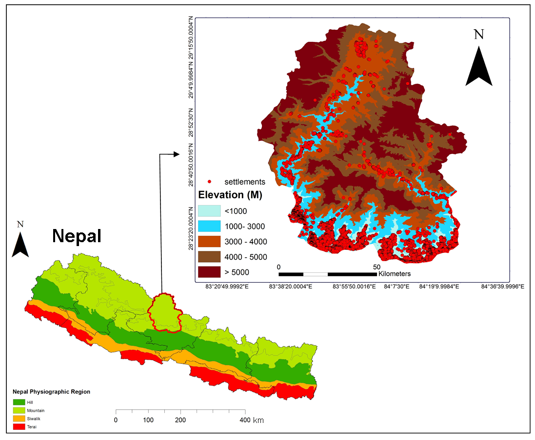Annapurna Conservation Area (Figure 1) is Nepal’s first conservation area model in which management principles are based on the participatory conservation with multiple land use precincts (Heinen and Kattel, 1992; Job and Thomaser, 1996) under the national trust for nature conservation and Annapurna Conservation Area (ACA) project and formerly known as King Mahendra Trust for Nature Conservation (Bajracharyae et al., 2007; Thakali, 2012). ACA covers an area of 7,629 sq. km of Manang, Mustang, Kaski, Myagdi, and Lamjung districts of Gandaki province (Figure 1) with the warm subtropical climate at Southern part with cold and semi-desert in the Northern part with an altitude ranging from 790 m to 8036 m (Annapurna I peak).