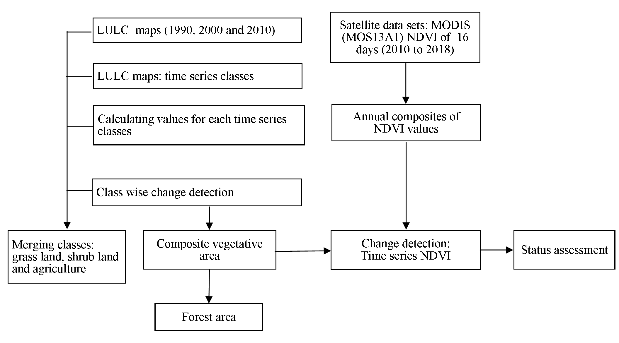 MODIS remote sensing imagery derived variables has been successfully used to detect land and forest degradation in the tropics. This study, therefore, gathered quantitative data on using a multi-time series of LULC, NDVI data and analyzed for greenness variations over time. The findings of this analysis enable a new assessment of possible conservation and management strategy options for sustainable management of natural ecosystem in the study area and elsewhere in the world.