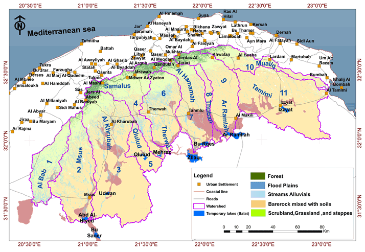 The South of the Al Jabal Al Akhdar area assessed spatially, where the results show large and wide watersheds with low and moderate slopes. The land cover assessment shows only the Northern parts covered with forest, while the most are barren lands intercalated with alluvial plains, spreading zones, grassland. The watersheds receive a considerable amount of precipitation, which small quantities harvested or naturally recharged to the groundwater aquifers. Unfortunately, the rest unallocated and appropriately invested, as most of the rainfall lost by evaporation because of the high-temperature in the South parts of the study area. Moreover, the remain of runoff goes to the sudden floods that occur annually leading to natural disasters that cause human and economic losses, in addition to soil loss by erosion and transport from the North to the South as its noticed from the land cover map, where this loss will lead to degradations in the Northern parts of watersheds. Finally, the study area very vital, especially for pastoral activities, also promising in surface water investment rainfed agriculture, but the watersheds require further detailed studies for the morphometric and hydrological characteristics. Although these studies rely on data, which are scarce in the study area, earth observation satellite data are adequate with the support of ground-truth.
