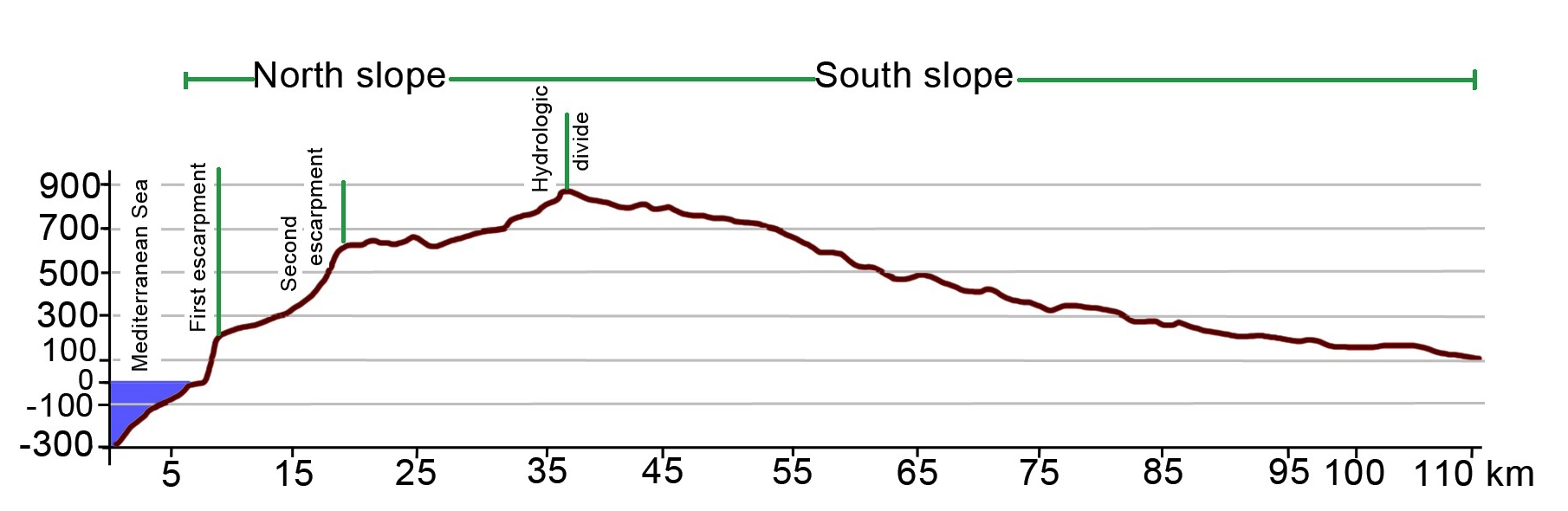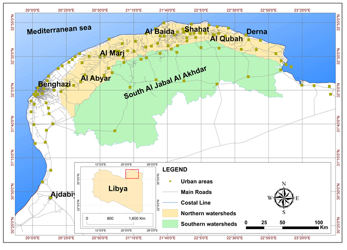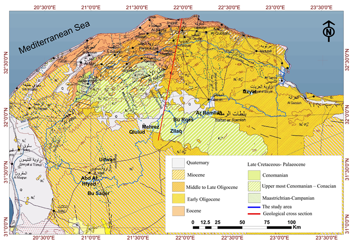 The study area located Northeast Libya, known as Al Jabal Al Akhdar (Green Mountain), as illustrated in figure 1, which is a crescent-shaped ridge reaching more than 875m above mean sea level in its central part as shown in the topographical profile (Figure 2). The Northern slope consists of two escarpments, divergent in the West but convergent gradually closer in the East direction; both escarpments are parallel to the Mediterranean seacoast. Also, the two escarpments dissected by several wadis, especially the second (Pallas, 1978). On the other hand, the Southern slope dips gradually toward the South. The hydrologic network Al Jabal Al Akhdar reflects the morphological features that divided into the Northern watersheds those flows to the North, which are short and profoundly cut and reach the sea after a few tens of kilometers, and the Southern watersheds those flows to the South, which are long, wide, and flat. They progressively disappear as valleys and become large spreading zones at the Southern breaking slope of Al Jabal Al Akhdar (Hamad, 2005).