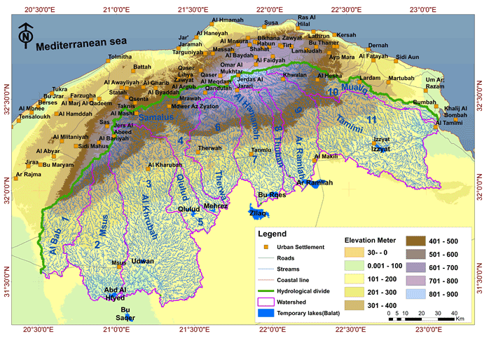 Spatial characteristics of the watersheds located in Northeast Libya were analyzed in the study.