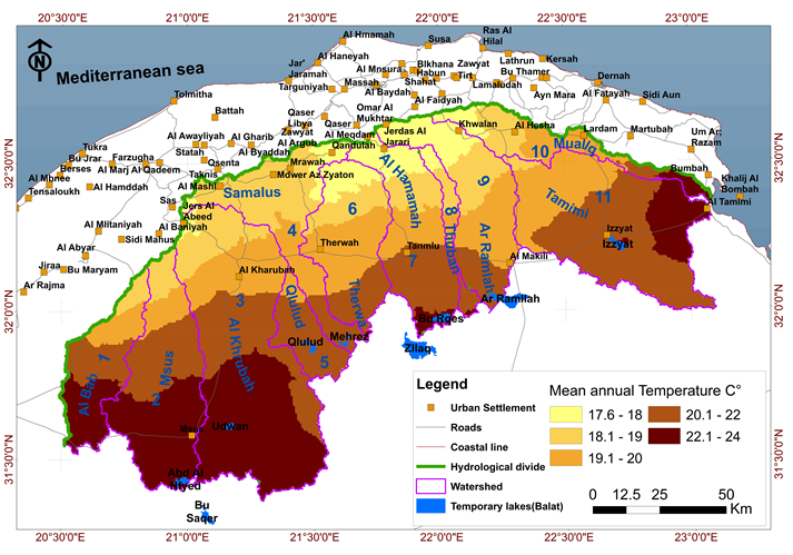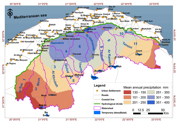 The present study is to evaluate the spatial characteristics of the watersheds located in Northeast Libya, which is vital since the area is promising for surface water investment in rain-fed agriculture and pastoral activities. The study conducted using Geographical Information System (GIS) and Remote Sensing (RS) data sets: SRTM elevation data, Landsat 8 (OLI) imagery and Global Climate Monitor (GCM) data. SRTM data processed in ArcGIS, where elevations show a progressive decrease towards the South and eleven watersheds delineated (17721km2). Moreover, the perimeter, slope, aspect, and stream length of the watersheds also calculated. The hydrologic divide bounds the watersheds in the North delineated; it extends from the Southwest to the East with a length of 470km. Also, the outlets of the watersheds, which are mostly temporary lakes, those locally known as Balat assessed spatially. Landsat 8 imagery classified by Quantum GIS (QGIS), where five classes identified (alluvial plains, spreading zones, forest, grassland and bare rocks). Furthermore, precipitation and temperature data from the GCM was mapped, where the precipitation shows the highest rates in the North and gradual decrease to the South, unlike the temperature values indicate an increase towards the South and drop in the North.