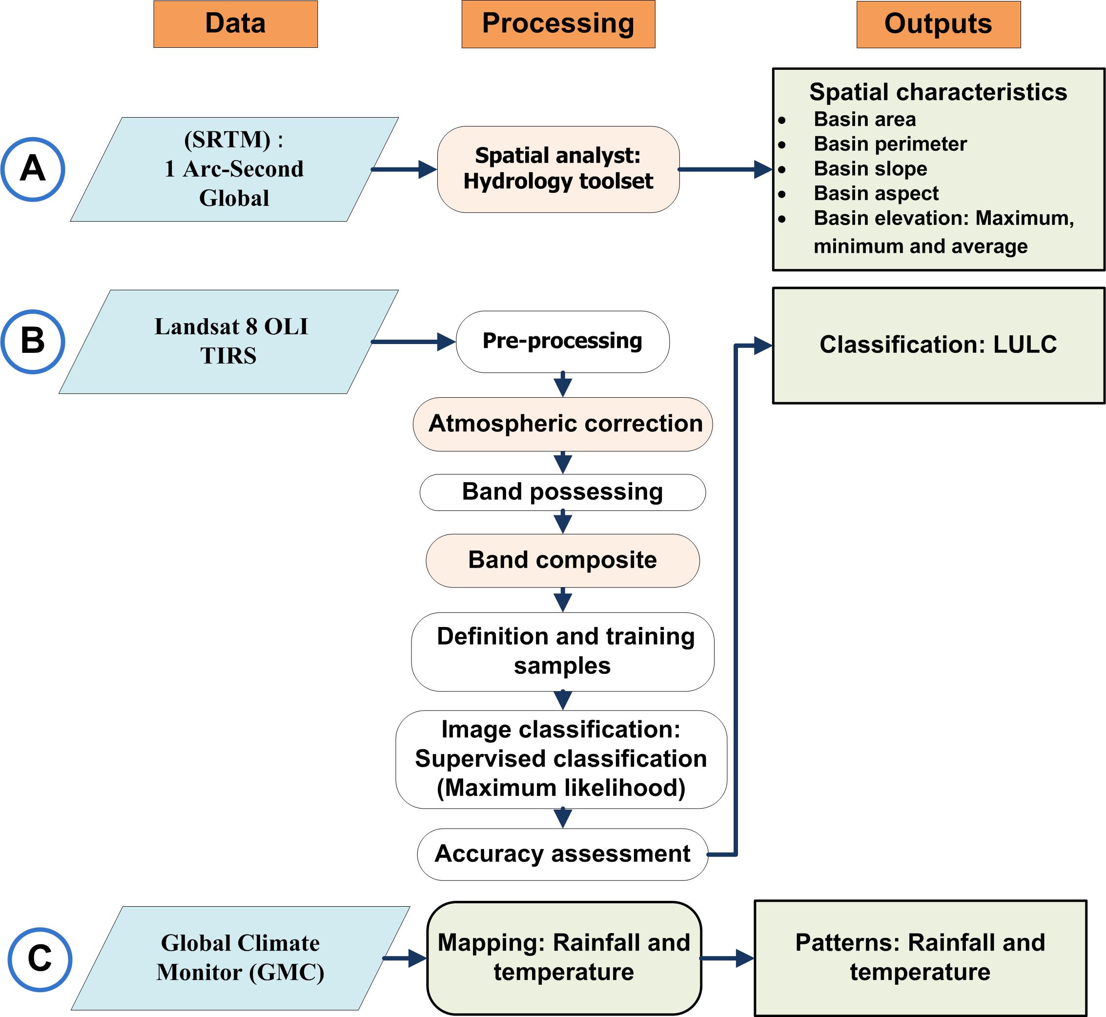 The research methodology summarized as in figure (Figure 4) based on the data given in table 1. The watershed delineation conducted using the hydrology toolset in the software, ArcGIS Spatial Analyst extension. The tool offers elevation data processing to delineate watersheds, create stream networks through sinks identifications, and flow direction determination, and flow accumulation calculation, in addition to morphometric parameter computation and hydrologic analysis (ESRI, 2018). The hydrology toolset used the digital elevation model (DEM) data from Shuttle Radar Topography Mission (SRTM) available at the USGS Earth Resources Observation and Science (EROS).