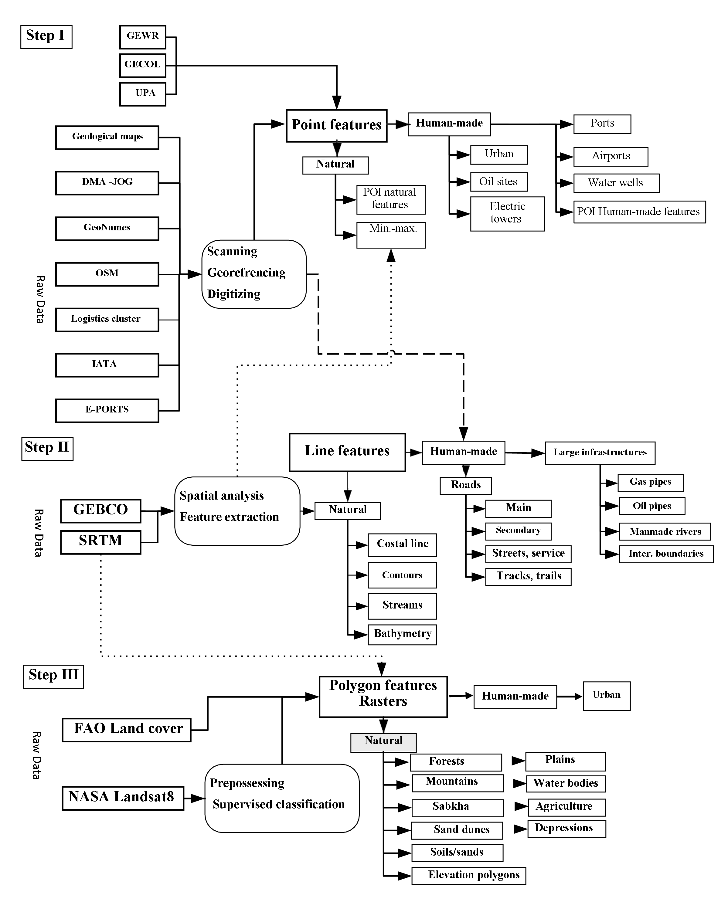 The point features processed as in step-I of the workflow in (Figure 3) Geological maps scanned and georeferenced using QGIS software, and the Point of Interest (POIs) extracted. Also, the geological maps used for verification, in particular, the geographical location labels for point data obtained from the platforms (OSM, GeoNames, Logistics Cluster) and the topographic maps of DMA- JOG. Other point data such as electricity towers, airports, oil sites, etc. are also included, as shown in (Figures 3). The SRTM data also analyzed for each map grid to extract points of higher and lower elevations.