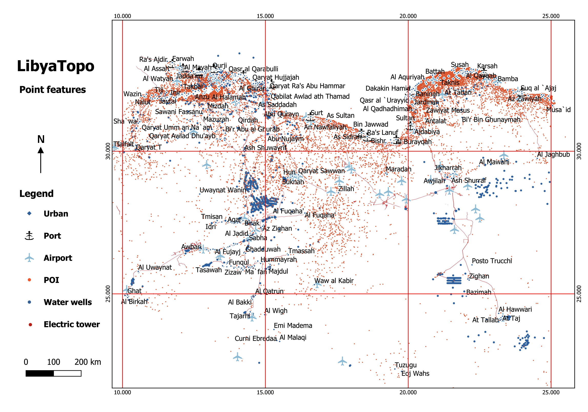 Urban point features created according to the Libyan UPA, and due to lack of recent accurate census data and the Libyan urban areas classification (town, village, town), the urban features left unclassified, and add to the layout of the maps without designation. Airports and ports point features extracted mainly from OSM and logistic cluster and verified by the International Air Transport Association (IATA) and World Ports database (E-PORTS). Moreover, water wells, oil sites, and electric towers extracted from GEWR and GECOL database in addition to OSM.