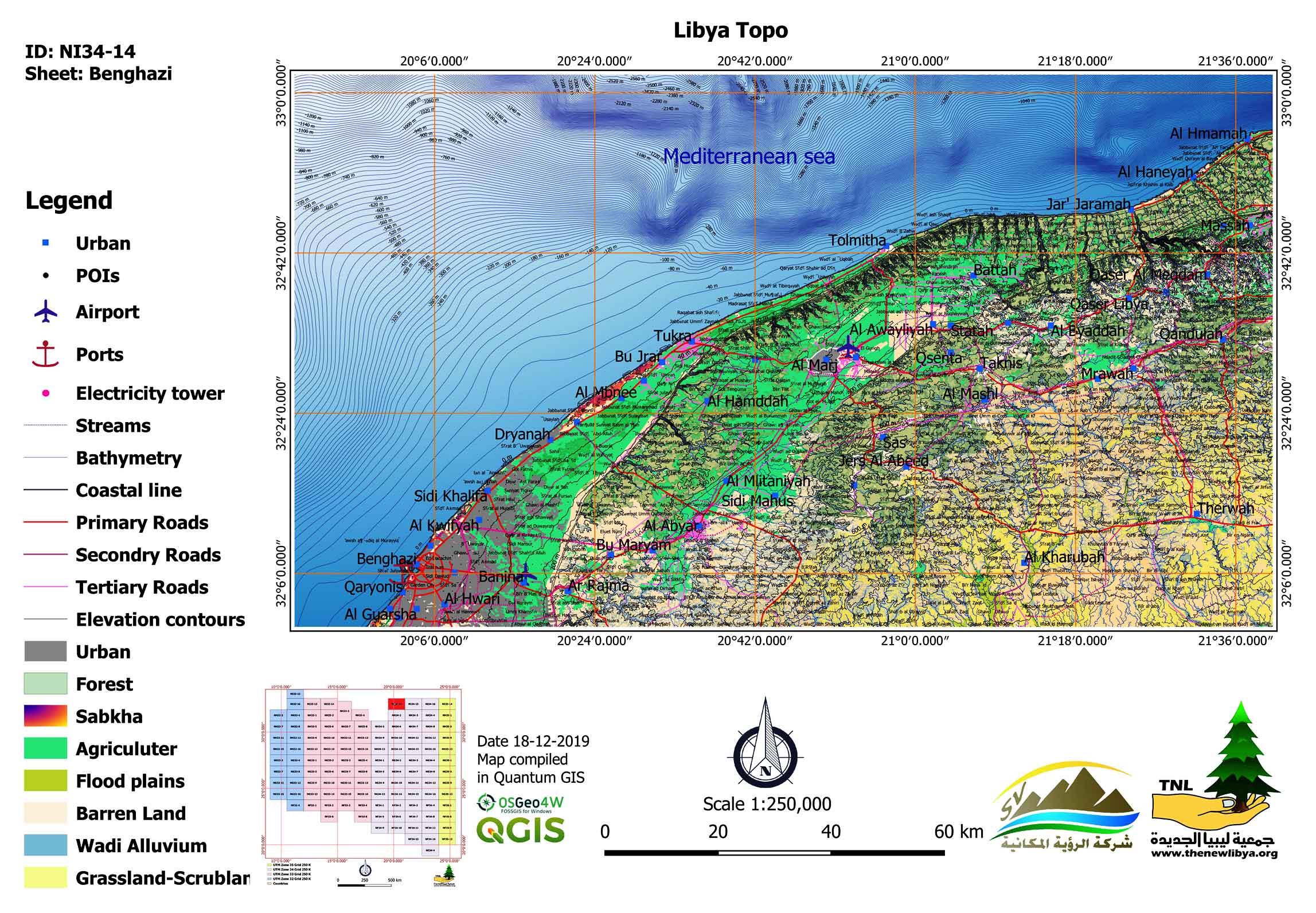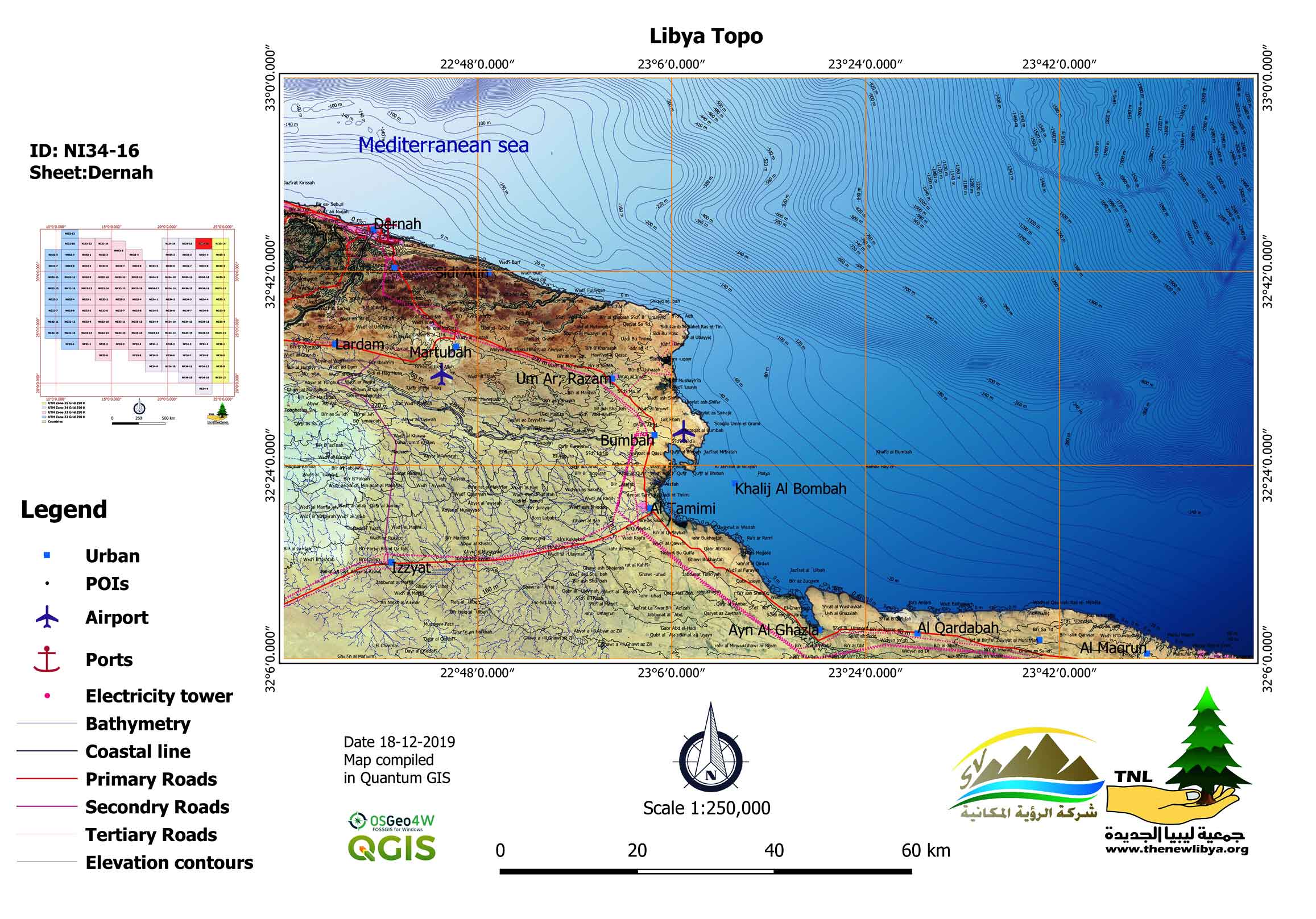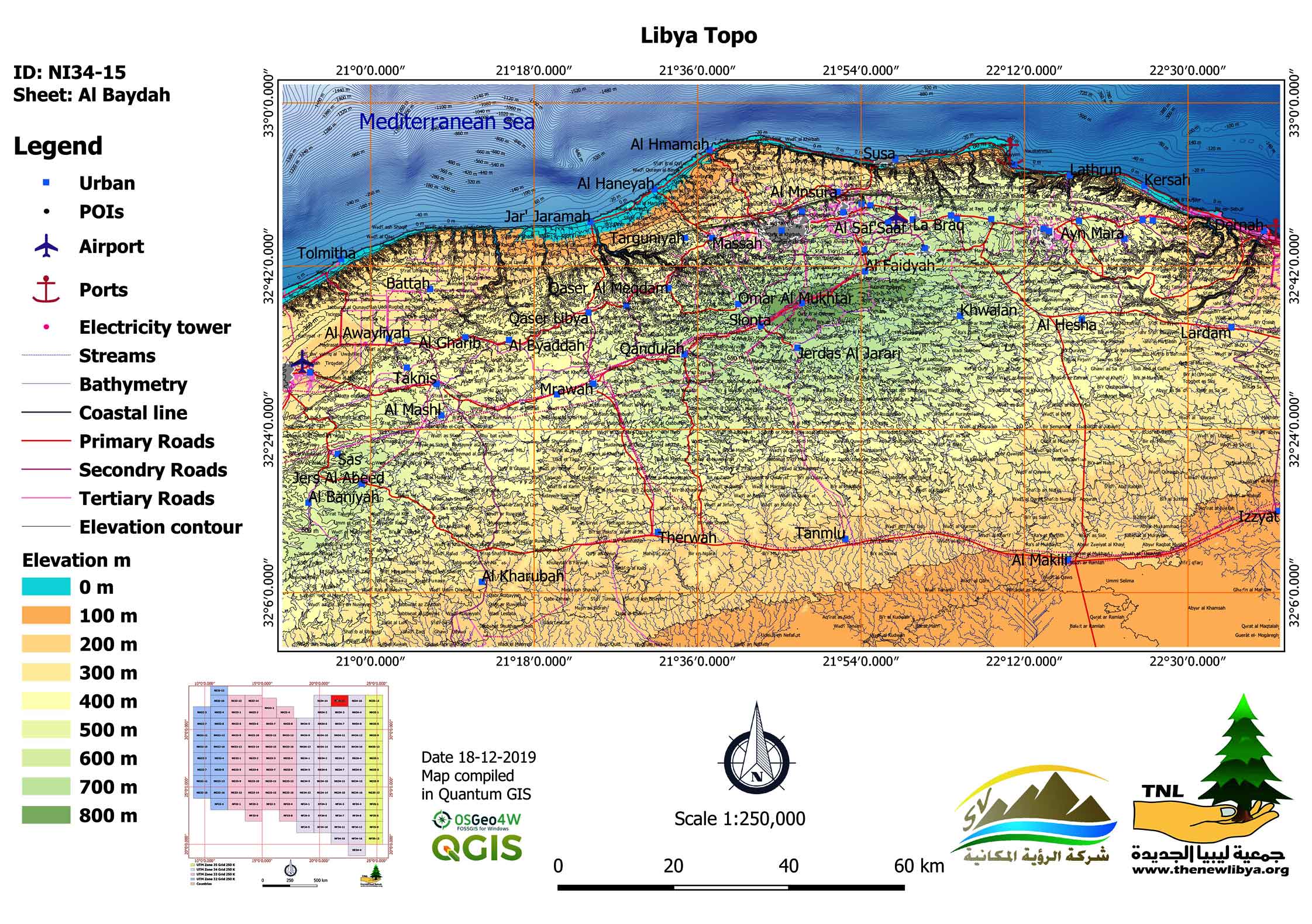 From the beginning of the twentieth century, topographic maps for the Libyan state carried out by various compilers, where the first mapping was carried out by the Italian Military Geographical Institute, the Soviet Union Military, and the U.S. Army, followed by mapping carried out by the Libyan state from the 1950s to the 2000s. Most of these maps have not been digitized and updated using the techniques of geographic information systems and remote sensing. This paper discusses on the objectives, methodology and results of the Libya Topography Project, “Libya Topo” for updating the previously compiled topographical map at scale, 1:250000. Open spatial data from different platforms (OSM, Logistics Cluster, Landsat 8 satellite imagery, and SRTM data, etc.). Also, POIs extracted from previously compiled topographic and geological maps. Spatial database for each UTM zone created to store the features and raster. As for the cartographic style, the map layout adopted is the style of the U.S. Defense Mapping Agency maps. The results of the project are an update of 121 topographical map sheets using Quantum (GIS), those will be freely available for the interested users on request (e.g., environmentalists, academics, and university students, etc.).