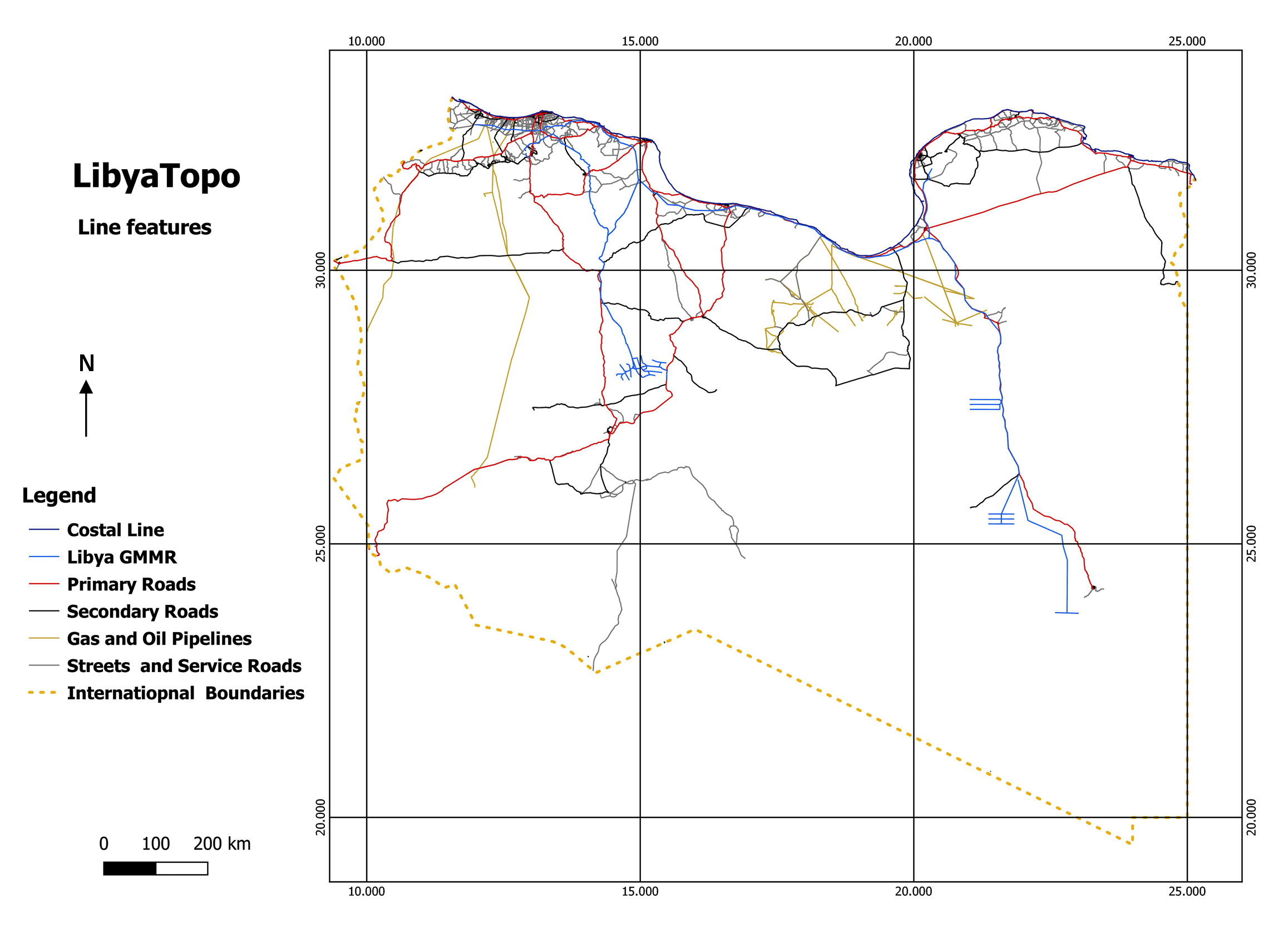 Data for human-made line features, such as roads, oil, and gas pipelines and the Libyan man-made river, were used extensively from (OSM, Logistics Cluster, and verified via NASA Landsat-8 satellite imagery, and ESRI online base map world imagery. Also, the old topographic maps were an excellent guide for checking line features labels. Mainly, the natural line features extracted by the processing of the DEM processed according to step-II of the workflow in (Figure 4). The hydrology toolset provided in QGIS software automatically delineate a river basin Stream networks using GRASS tools in the processing toolbox. Additionally, the QGIS raster extraction was used for DEM processing to generate elevation contours and coastline features, and also for GEBCO raster to create bathymetry contours.