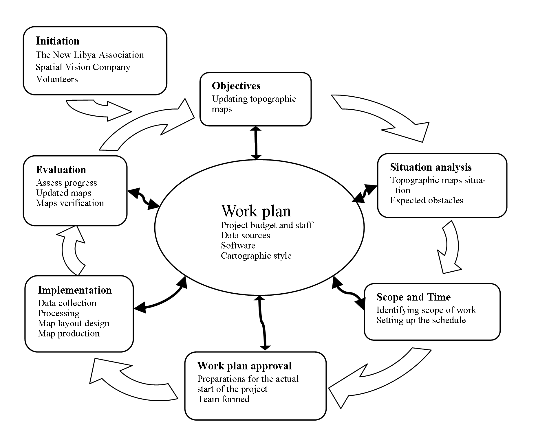 The project began in March 2015 on the basis of the project cycle summarized in (Figure 1) and was carried out in accordance with the workflow steps as shown in (Figure 2) and is still in progress. The project team was volunteer, where the group consisted of five GIS and RS-specialized technicians, administrators, and volunteers who contributed to verification for the names of geographical places. The funding was by the New Libya Association for Environment and Natural Resources.