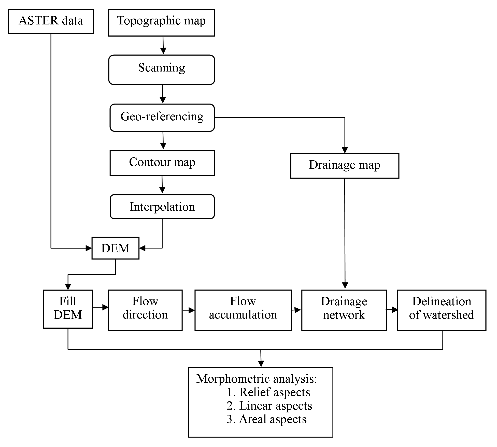 Morphometric analysis of River basins using conventional methods is very time consuming, laborious, and cumbersome also. Remote Sensing and GIS is accepted to be powerful geospatial techniques in preparing the drainage map and understanding the watershed’s morphometric parameters (Rao et al., 2011). To evaluate the morphometric analysis using Geographical Information Systems (GIS) was attempted by several researchers (Srinivasa et al., 2004; Markose et al., 2014; Das, 2014; Kaliraj et al., 2015; Gajbhiye, 2015; Sahu et al., 2016; Pande and Moharir, 2017; Rai et al., 2017; Chandniha and Kansal, 2017).