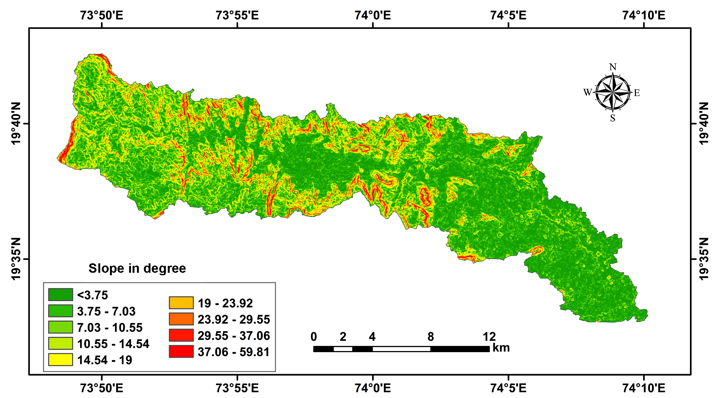 The slope angle indicates the magnitude of the component of the gravitational surface acting to produce movement of solid bodies, water or soil particles down a slope (Strahler, 1956). Slope is a significant morphological parameter which directly controls infiltration and runoff of any terrain. The slope map for Adula River basin (Figure 9) was developed with the help of DEM using Arc GIS Spatial Analyst tools. About 83.83% area of Adula River basin comes under gentle and moderate slope (<14.54), which indicates nearly flat terrain and most favorable for infiltration.