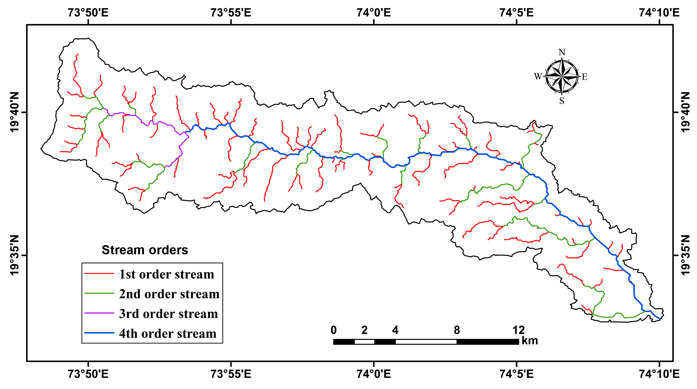 Number of streams is also described as total counts of stream segments of different order separately and is inversely proportional to the stream order (Chandniha and Kansal 2017). Stream numbers of 1st, 2nd, 3rd and 4th order streams are 89, 19, 2 and 1, respectively. The number of streams segments gradually decrease with increase in stream order. High number of 1st order streams some time responsible for sudden flash floods after heavy rainfall.