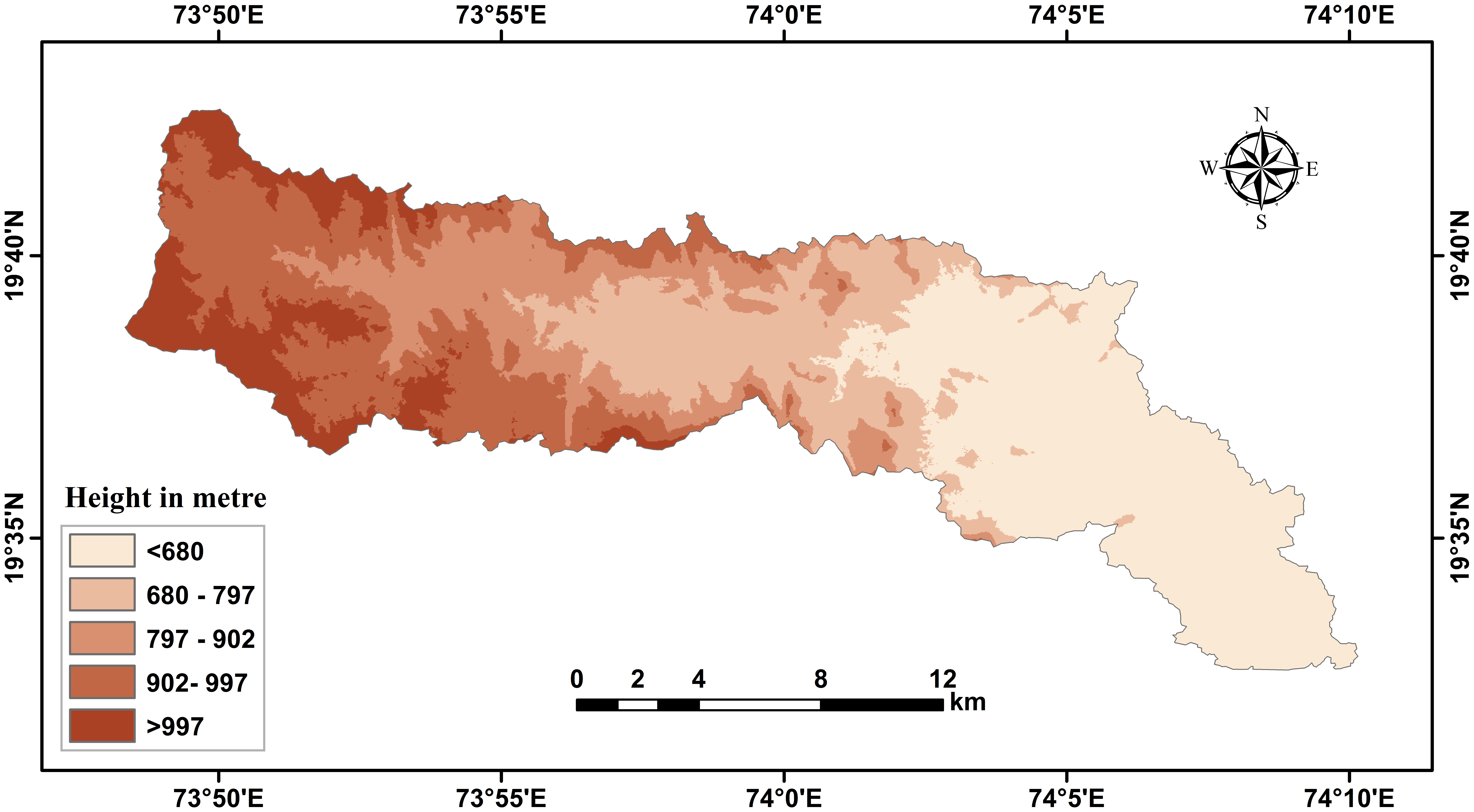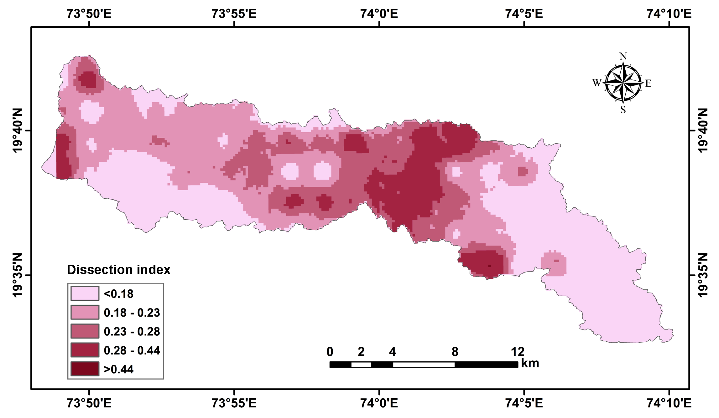 Dissection index (Di) is expressing the ratio of the maximum relative relief to maximum absolute relief. It is an important morphometric indicator of the nature and magnitude of dissection of terrain (Singh, 2000). The value of dissection index varies from zero to one, where zero indicates complete absence of dissection and one indicates vertical cliff. Generally, low ‘Di’ corresponds with the subdued relief or old stage, and with low relative relief. Conversely, the areas with high ‘Di’ indicate high relative relief where slope of the land is steep (Deen, 1982). The dissection index, for the study are varies from 0.18 to 0.49. It has been classified into five categories (Figure 10). Very low (<0.18) dissection index has been found mostly in the eastern part of the basin i.e. Chikhali, Rajapur, Biroba wasti, Dongargaon area. Moderate to moderately high (0.18-0.28) dissection index was found Northwestern part of the basin. High dissection index (>0.44) found at the central and the western most part of the basin. The main localities under this category are Deothan, Kokanwadi, Chandgirwadi, etc.
