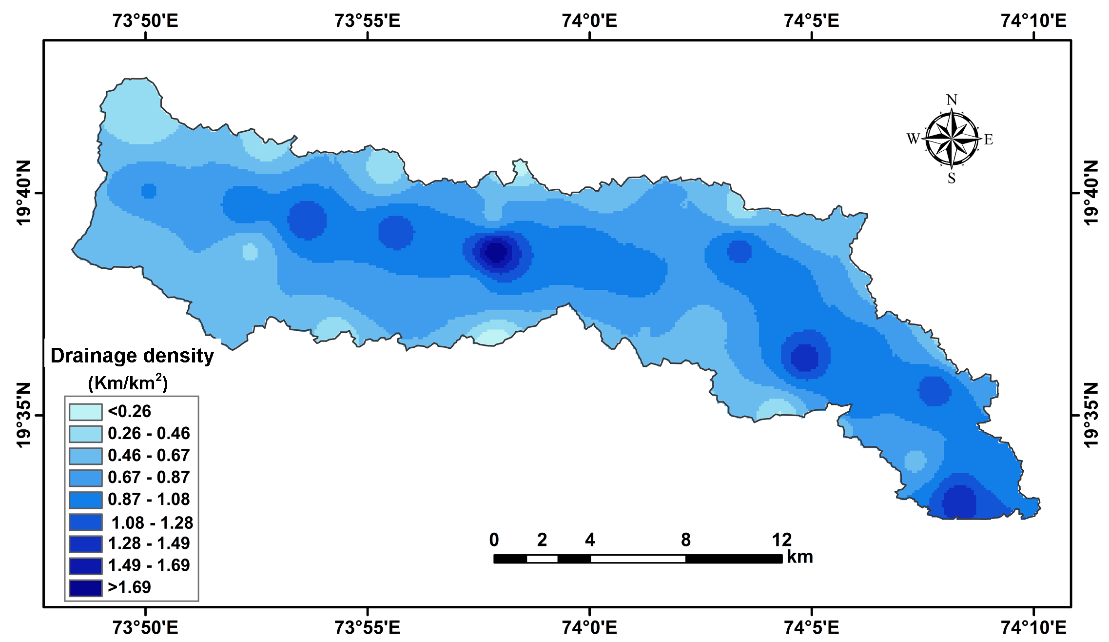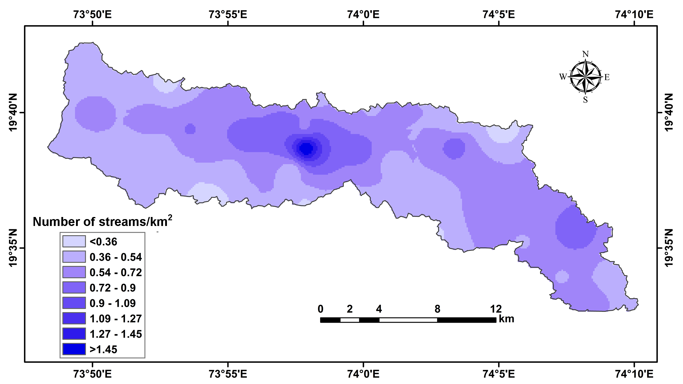 Drainage density is one of the important indicators of the landform element and provides a numerical measurement of landscape dissection and runoff potential (Chorley, 1969). It is defined as the total stream length in a given basin to the total area of the basin (Strahler, 1964). The drainage density in the study area is critically low (Figure 4). The drainage density of the study area has been classified into nine different textures. Comparatively high drainage density (>1.28 km/km2) was found at the central and the eastern most part of the basin. The main localities under this category are Samsherpur, Tahakari, Hivargaon etc. Low and moderate texture drainage density was found at the both northern and southern most part of the basin.