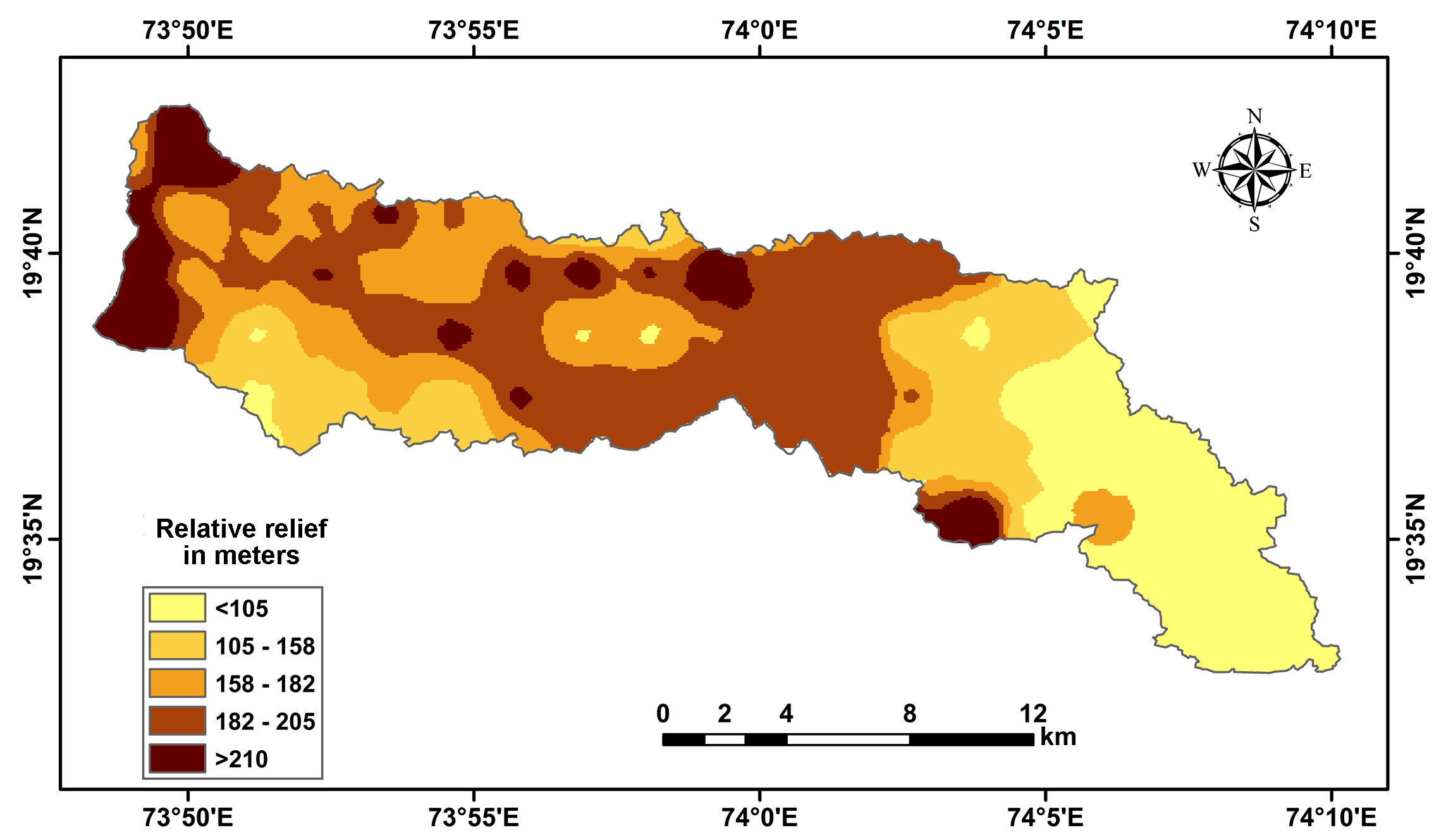 The relative relief (Rr) represents actual variation of altitude in a unit area with respect to its local base level. The relative relief does not take into account the dynamic potential of the terrain but as it is closely associated with slopes and it is more expressive and also useful in understanding the morphogenesis of this region (Bhunia et al., 2012). Relative relief of entire study area is divided into five categories (Figure 8). High relative relief (>205m) was found in the upper most part of the basin and some small pockets of high relative relief were also illustrated in the western and central part of the basin. Moderately relative relief (158 -205m) found in the central and western most part of the basin. Lowest relative relief (<105m) was found in the eastern most part of the basin.