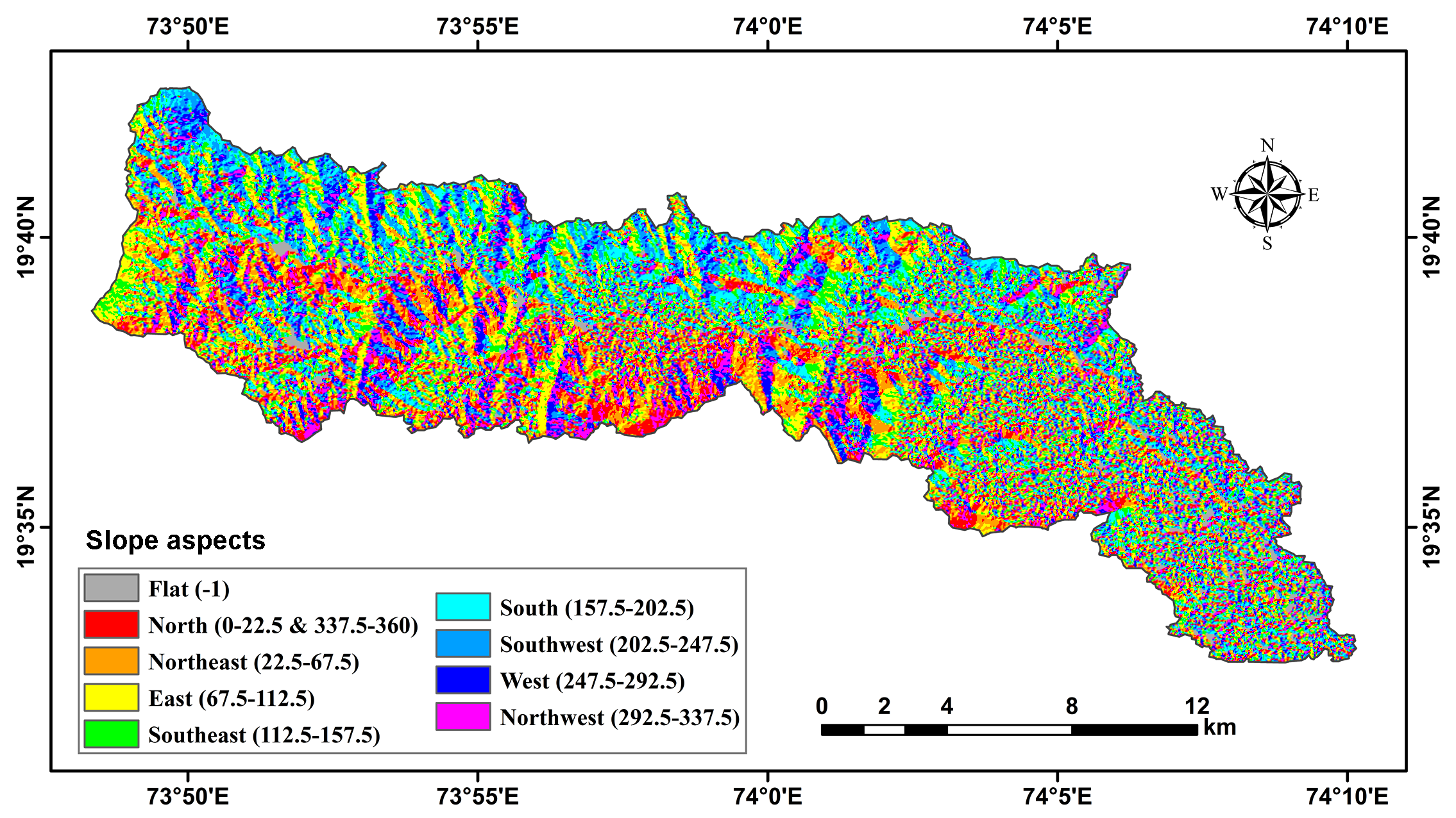 Aspect map generally refers to the direction to which a mountain slope faces. The aspect map is a very important parameter to understand impact of sun on local climate of the area. Generally west facing slope showing the hottest time of day in the afternoon and in most cases a west-facing slope will be warmer than sheltered an east-facing slope (Singh et al., 2014). Aspect has significant effects on growth and type’s vegetation distribution of an area. The aspect map of the Adula River Basin was derived from ASTER DEM. The slope aspects of entire basin is divided into ten categories: Flat-1, North- 0-22.50, Northeast- 22.5-67.50, East- 67.5-112.50, Southeast- 112.5-157.50, South- 157.5-202.50, Southwest- 202.5-247.50,West- 247.5-292.50, Northwest- 292.5-337.50, North- 337.5-360. Principal stream of the area is flowing from north-west to south-east direction. Aspect map (Figure 7) of Adula River basin indicates that the west to south-west facing slope are dominant along the left bank of the principal.