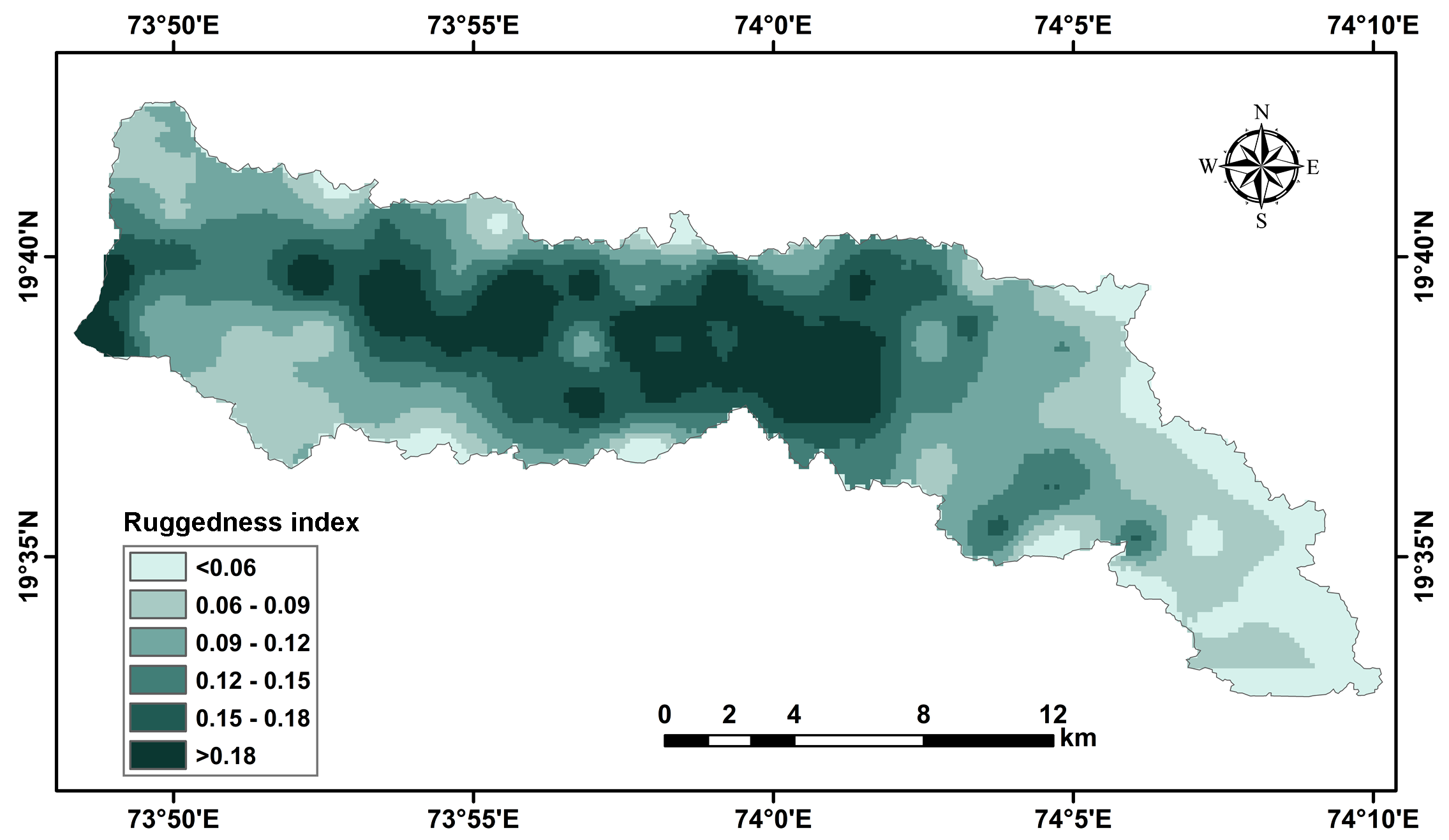Ruggedness Index indicates roughness of the terrain and the degree of dissection of topography where drainage has considered as an important parameter. This index is being widely used by the earth scientists in connection with the morphological studies of terrain and it leads to better understanding of the surface configuration evolved under complex geomorphic processes. This index reflects the combined effects of evolutionary rhythmic processes in the development of relief (Prakasam and Biswas, 2012; Mukhopadhyay, 1984). Ruggedness index (Figure 11) varies from 0.04 to 0.21.